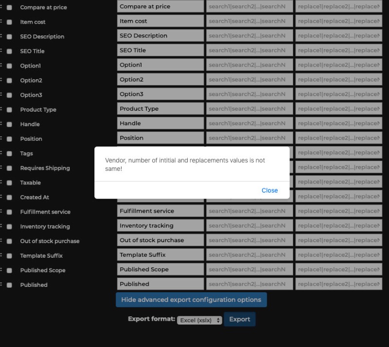 I generate a weekly inventory report for my store in a specific format. I have some fields that are required by the retailer that just need to be filled in. I just leave the search field blank and include a replace value. In the past, this has worked fine. Today when I ran the report I got an error: "Vendor, number of initial and replacements values is not same! I last ran the report unchanged last Tuesday, so something seems to have changed between then and now.