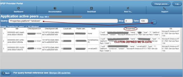 What is interesting about that is that we can put any property by our will and later be able to search peers by their value. Our query is exactly that "Properties.platform":"windows" ."platform" property would be custom property someone decided it would need meta-data from its application (although he had OS column given automatically from API).