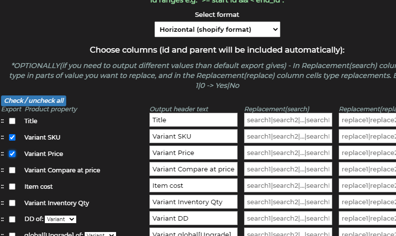 We can choose columns we want to export. For example common file formats for shops could be just SKU and Price CSV. Let's make such a file. I will choose the Horizontal format since SKUs and Prices exist only for variants [NARRATOR SELECTS the HORIZONTAL format] . I will now click “Check/Uncheck” to turn off all columns [NARRATOR clicks “Check/Uncheck” button in the export dialog to uncheck all] .